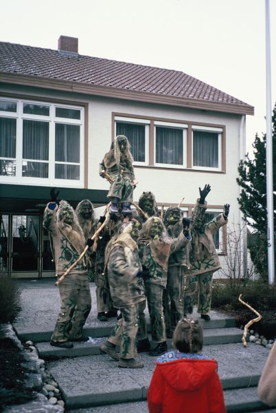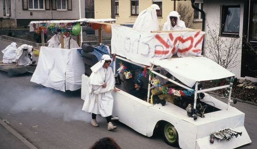 Nach der Saison kam den Freunden der Gedanke mit Maske und Häs am Umzug teilzunehmen. Aus Kunstharz entstanden die ersten Masken und das Häs wurde aus alten Säcken mit der Heißklebepistole angefertigt.